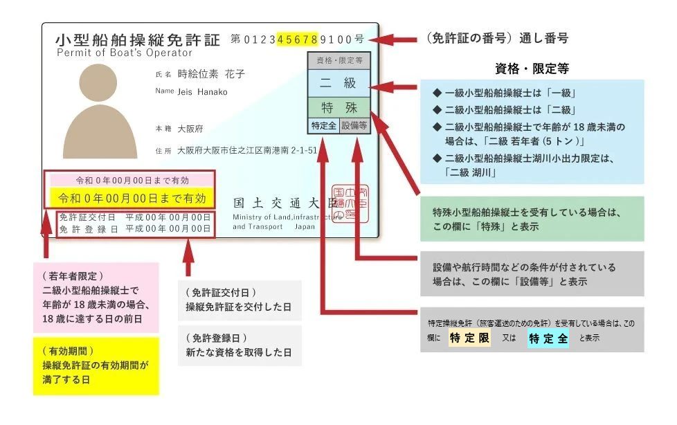 ※二級免許について年齢が18歳未満の方は、操縦できるボートの大きさが5トン未満に限定されます。